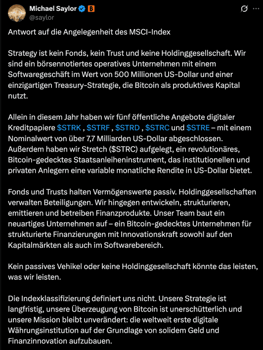 Der Grund? MSCI prüft, ob Firmen mit mehr als 50 % Vermögenswerten in Kryptowährungen überhaupt in “klassische” Indizes gehören.