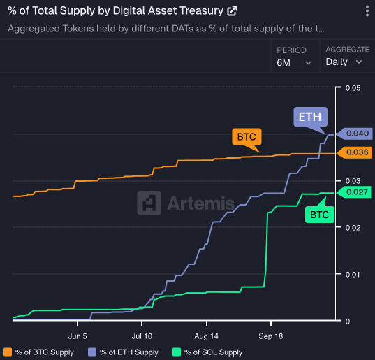 Mittlerweile befinden sich rund 4,0% aller ETH in den Händen der DATs, während es bei BTC “nur” 3,6% und bei SOL 2,7% sind.