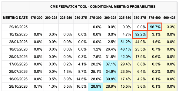 Die Märkte preisen deshalb mit einer sehr hohen Wahrscheinlichkeit nächste Woche und Anfang Dezember jeweils eine Zinssenkung ein.