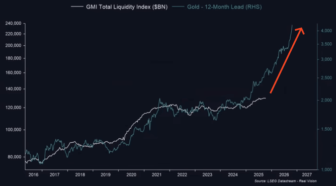Er geht zudem davon aus, dass Gold ein Vorläufer des Total Liquidity Index ist – ein Index für die verfügbare Gesamtliquidität im Finanzsystem.