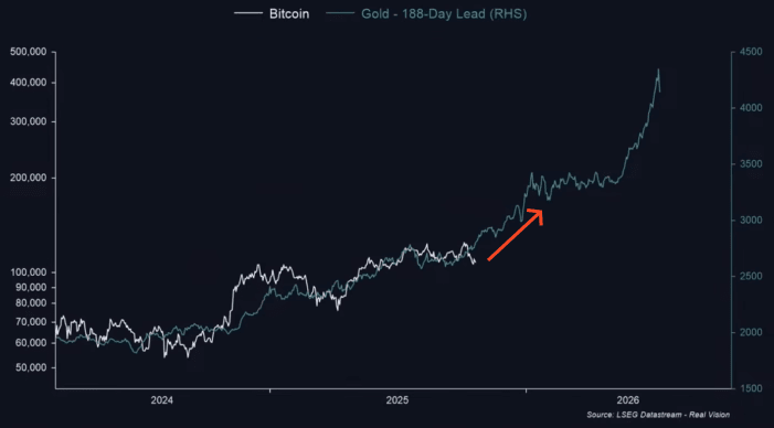 Laut Raoul Pal soll Gold zudem rund 188 Tage vorlaufen, während andere eher von einem Vorlauf von rund 100 Tagen ausgehen.