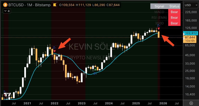 Zudem sieht es derzeit stark danach aus, als ob BTC auch die zweite Woche unter dem 350-Day Moving Average ($103k) schließen würde.